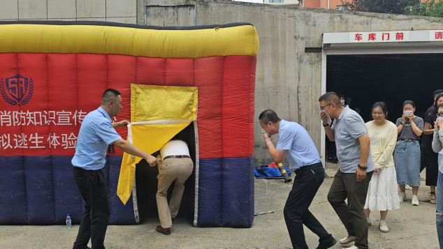 培訓后,現(xiàn)場實操干粉滅火器、水基滅火器及滅火毯使用,并通過安裝消防模擬逃生體驗屋,開展沉浸式應急疏散逃生演練,模擬實際情況,在全部煙霧條件下,消防教員帶領大家進行了火災逃生演練,伴隨著“火情警報”,在消防教員的指揮下,全體職工彎腰低姿、濕毛巾捂鼻,從模擬屋有序撤離,“逃生”到安全區(qū)域。全體人員各司其職,整個過程緊張有序,無擁擠踩踏現(xiàn)象,達到了演練預期效果。