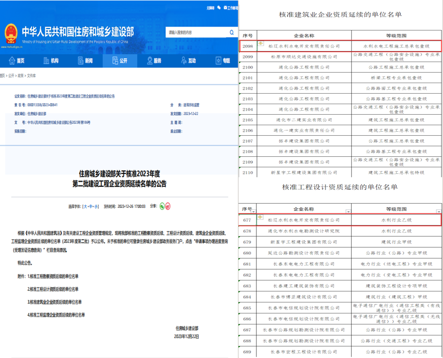 近日,經(jīng)中華人民共和國(guó)住房和城鄉(xiāng)建設(shè)部核準(zhǔn),松遼水利水電開發(fā)有限責(zé)任公司申報(bào)延續(xù)的水利水電工程施工總承包一級(jí)資質(zhì)、水利行業(yè)設(shè)計(jì)乙級(jí)資質(zhì)成功獲批!