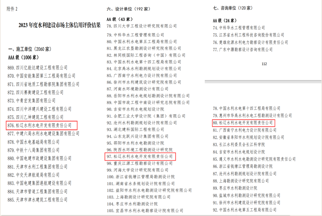 同時(shí),全國(guó)水利建設(shè)市場(chǎng)主體信用評(píng)價(jià)工作再添喜訊!經(jīng)中國(guó)水利工程協(xié)會(huì)核準(zhǔn),公司施工類信用評(píng)價(jià)取得AAA級(jí)。經(jīng)中國(guó)水利水電勘測(cè)設(shè)計(jì)協(xié)會(huì)核準(zhǔn),公司水土保持方案編制類信用評(píng)價(jià)取得AAA+級(jí)、設(shè)計(jì)類信用評(píng)價(jià)取得AA級(jí)、咨詢類信用評(píng)價(jià)取得AA級(jí)。在總體保持了各領(lǐng)域原有信用等級(jí)的基礎(chǔ)上,水土保持方案編制類由原來(lái)的AAA級(jí)榮升AAA+級(jí),是公司在信用評(píng)價(jià)工作中取得的新突破。