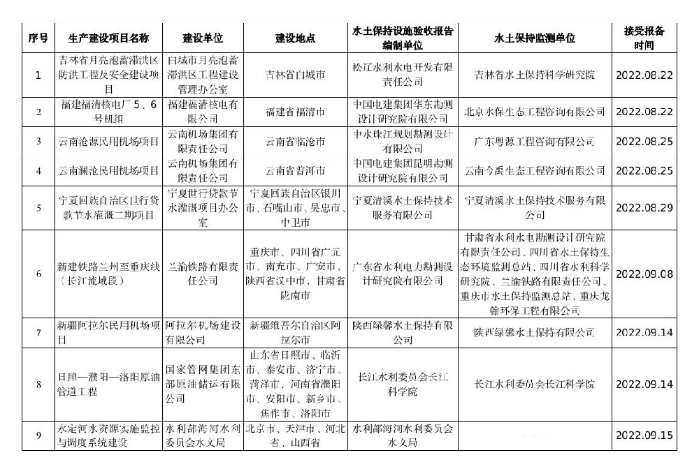 水利部關(guān)于2022年8月15日—2022年9月15日生產(chǎn)建設(shè)項(xiàng)目水土保持設(shè)施自主驗(yàn)收?qǐng)?bào)備接受公告